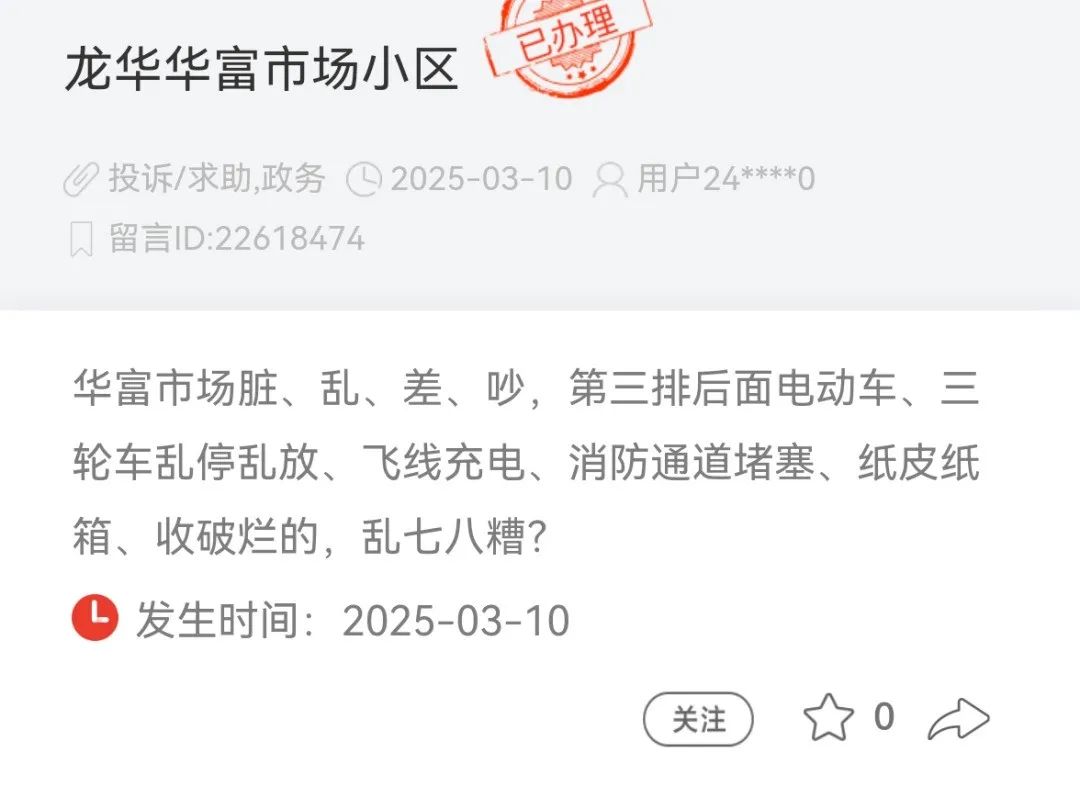 深圳市龙华市场运营有限公司华富市场管理方已对过道违规停放电动车、飞线充电等问题予以清理整治,加强公共区域卫生保洁,落实常态化巡查机制。