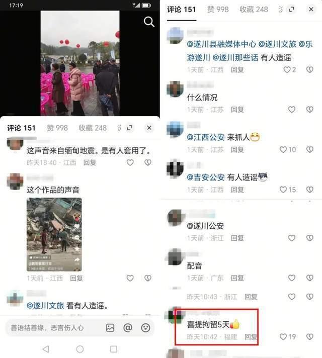 惊人的配音言论,大型活动现场人员较多,很快便吸引了大量网友点击观看。不过也有机智的网友发现了端倪,纷纷@公安官方账号,举报该视频造谣,甚至有网友直接给“喜提拘留5天”的评论。
