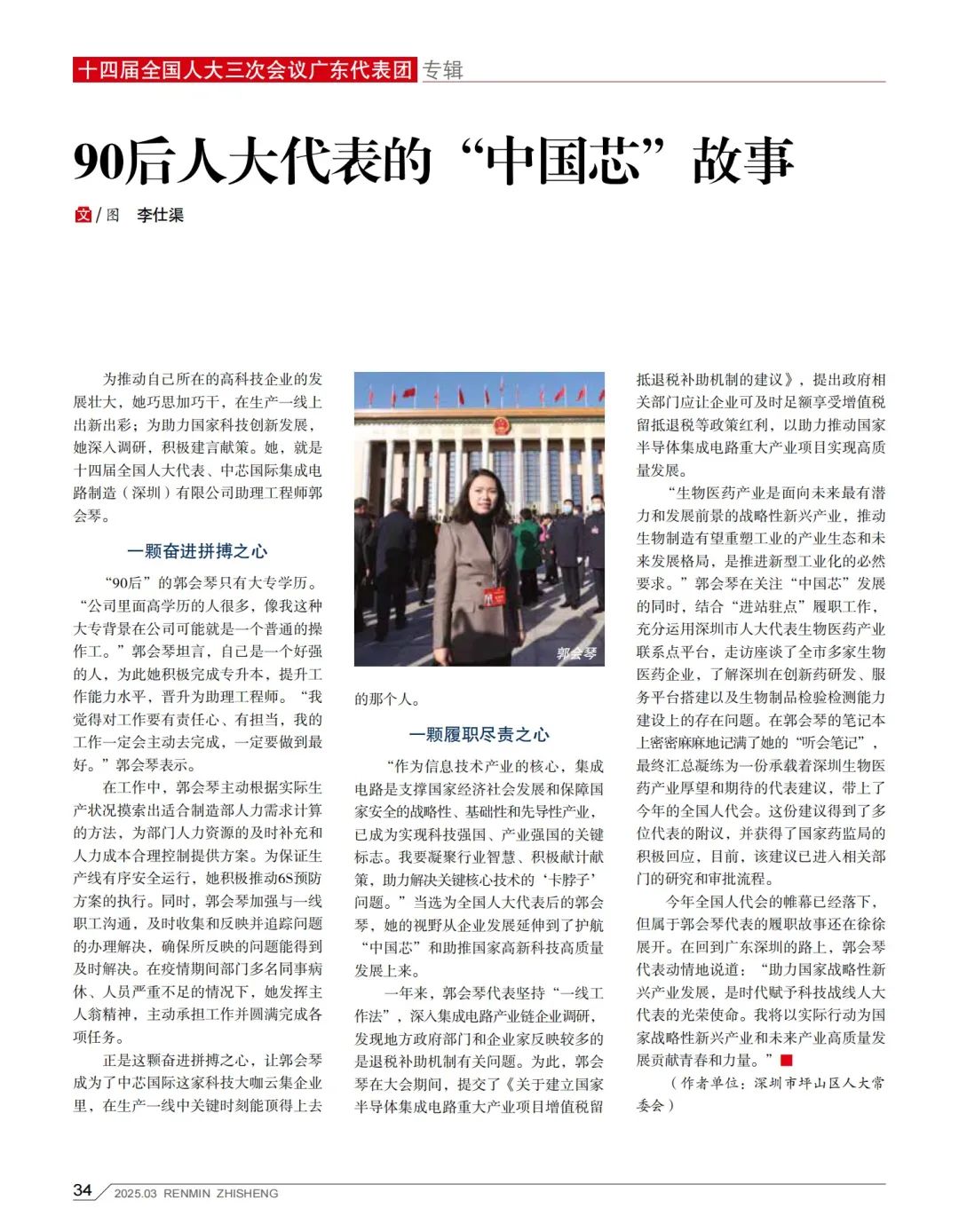 为推动自己所在的高科技企业的发展壮大,她巧思加巧干,在生产一线上出新出彩;为助力国家科技创新发展,她深入调研,积极建言献策。她,就是十四届全国人大代表、中芯国际集成电路制造(深圳)有限公司助理工程师郭会琴。