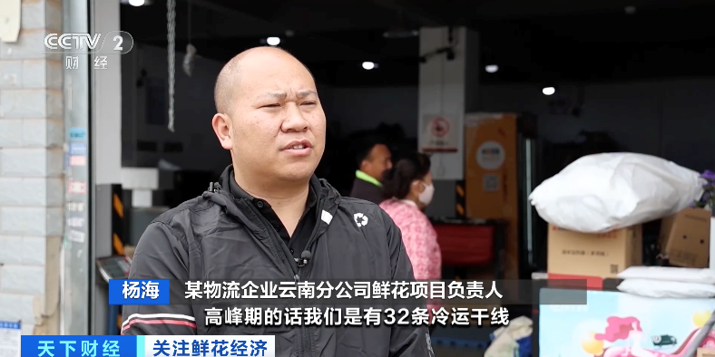 某物流企业云南分公司鲜花项目负责人 杨海:高峰期我们有32条冷运干线,可以实现500吨的鲜花冷链运输。空运我们每天可以保证的吨位有80吨,有136个城市可以保障当天到达。