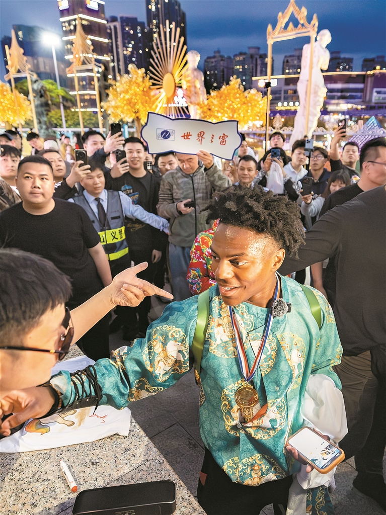 “甲亢哥”在深圳与游客开心互动。 深圳晚报记者 严文婷 通讯员 黄海峰 摄