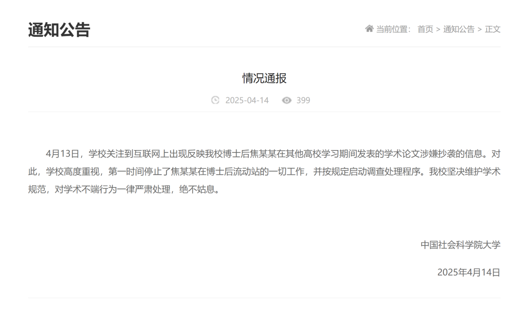 4月14日晚,中国社会科学院大学官网发布情况通报: