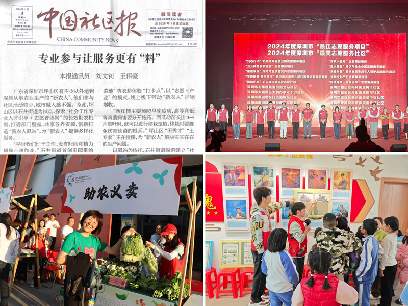 今年以来,坪山区聚焦融合试点四大任务,创新探索实施机制联建、队伍联动、项目联创、人才联育的“四联共治”发展模式,推动党建引领“专业社工+志愿服务”深度融合。其中,石井街道依托“新农人驿站”优化“社工+志愿服务”专业服务供给助力农业高质量发展相关经验获中央社会工作部主管《中国社区报》推广,先后被省委、市委社会工作部评选为“广东省最佳志愿服务项目”“深圳市最佳志愿服务项目”。坪山街道六和社区以服务、赋能、协商“三拳”发力推进党建引领“专业社工+志愿服务”深度融合,获评深圳市最美志愿服务社区,相关经验做法获《中国社会工作报》专题推广。