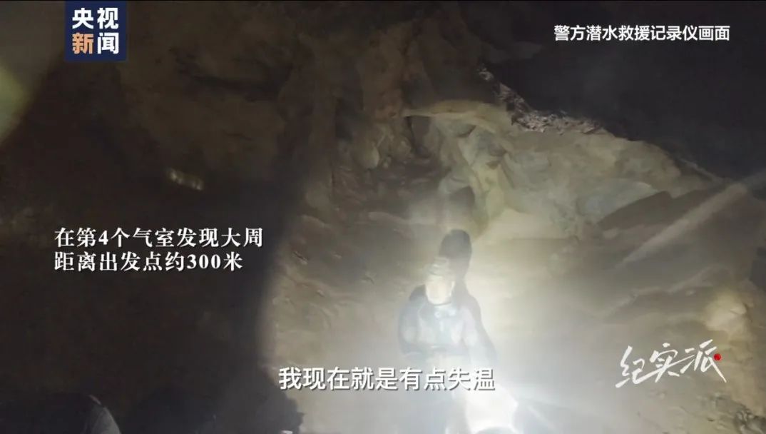 2月6日凌晨4:30,失联9.5小时后,搜救人员在第4个气室发现大周,距离出发点约300米。大周为了不失温,把潜水装备拆下来卡在石缝,人坐在上面。