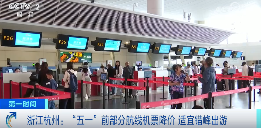 在浙江杭州,记者查询发现,在“五一”假期前,杭州出发的多条国内航线机票价格下降,最高降幅超过60%,适宜错峰出游。