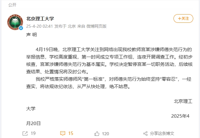 中新网4月20日电 北京理工大学20日在其官方微博发布声明称,4月19日晚,北京理工大学关注到网络出现该校教师宫某涉嫌师德失范行为的举报信息,学校高度重视,第一时间成立专项工作组,连夜开展调查工作。经初步核查,宫某涉嫌师德失范行为基本属实。学校决定暂停宫某一切职务活动,后续核查结果、处置情况将及时公布。