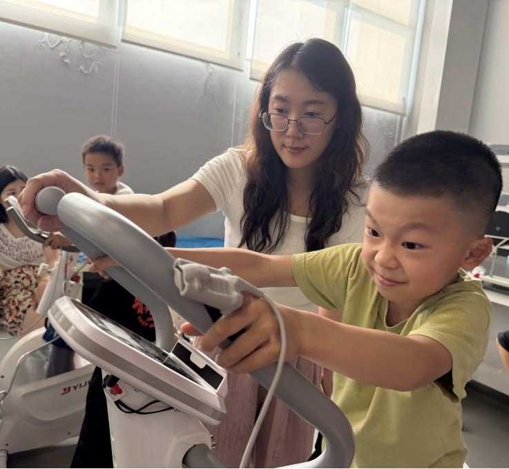 在深圳技术大学专业实验室里,12组亲子家庭通过骑行智能动感单车,实时观测运动时血氧、心率等生理数据变化。健康与环境工程学院的6名大学生志愿者化身“健康导师”,指导亲子家庭使用专业医疗设备监测健康指标。