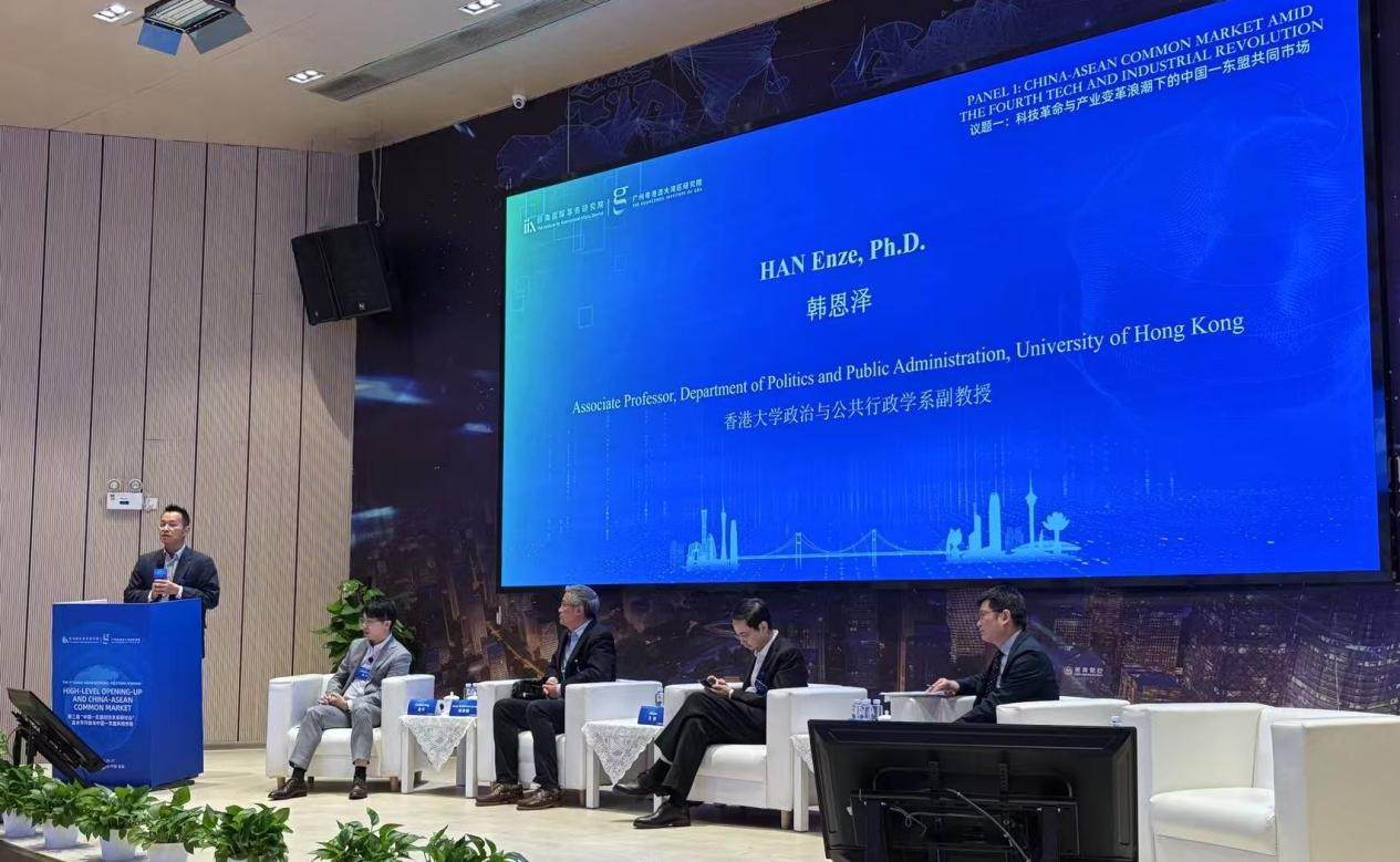 议题一围绕“科技革命与产业变革浪潮下的中国—东盟共同市场”这一课题展开讨论,由香港中文大学(深圳)前海国际事务研究院副院长、公共政策学院副教授黄平主持。香港中文大学地理与资源管理学系李卓敏讲座教授杨伟聪,北京绿色金融与可持续发展研究院院长马骏,中国社科院全球战略院大国关系研究室主任、教授钟飞腾,香港大学政治与公共行政学系副教授韩恩泽参与分享。主要围绕半导体发展、绿色金融、技术合作模式、经济一体化等维度展开分享。他们一致认为科技发展和技术变革有助于“中国—东盟共同市场”的建设,各国应该正确处理产业协作、贸易壁垒等问题,从而高质量推动共同市场建设及发展。