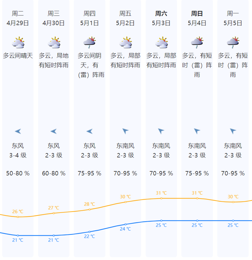 4月29日-30日受偏东气流影响,大致多云,局地有短时阵雨,气温下降,早晚清凉;