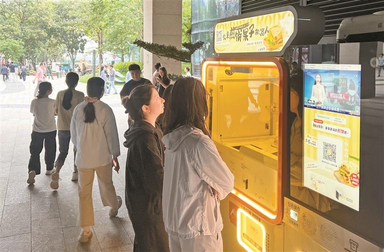 深圳新闻网2025年4月28日讯(深圳特区报记者杨浩翰 摄)近日,国内首款AI仿生制售一体餐饮机器人——煎饼果子机器人在福田区上线。该机器人位于深圳新一代产业园4栋一楼旁,可实现和面、摊饼、刷酱翻面、加料、折饼、装袋全流程仿生煎饼制作。