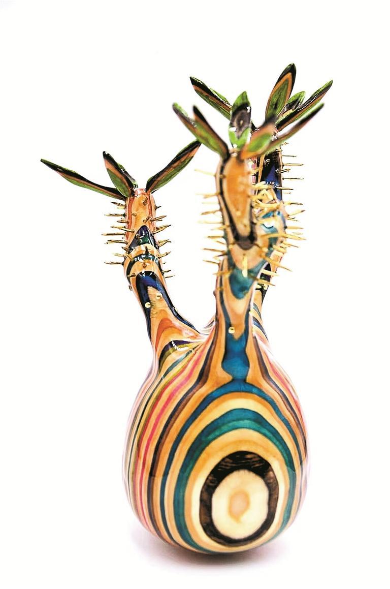 在啊果看来,不给自己设限,没有条条框框的约束,便意味着无限可能。“我创作一直是随心而想,想到什么就做什么。”用旧滑板雕刻成的骷髅头内刻有一个滑板碗池,这是啊果的作品之一,寓意一个满脑子都是滑板的人。