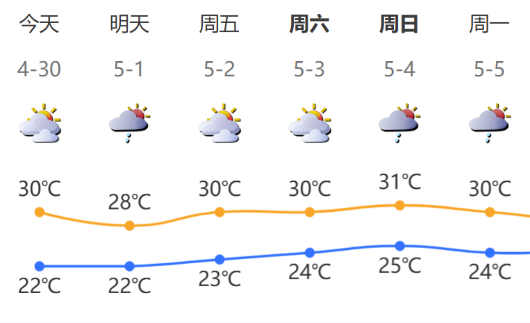 5月2-4日:多云为主,局地偶有短时阵雨,气温23-31℃;