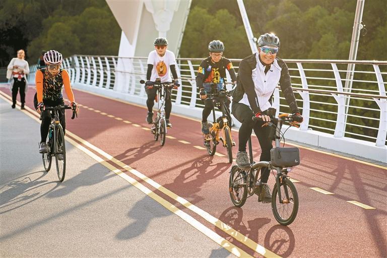 骑行爱好者在淘金山绿道大望桥段结伴骑行。