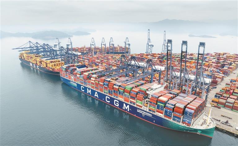 ▲4月29日,全球首艘、世界最大的24000标箱超大型集装箱船“达飞塞纳河”靠泊盐田港。深圳特区报记者 杨浩翰 摄