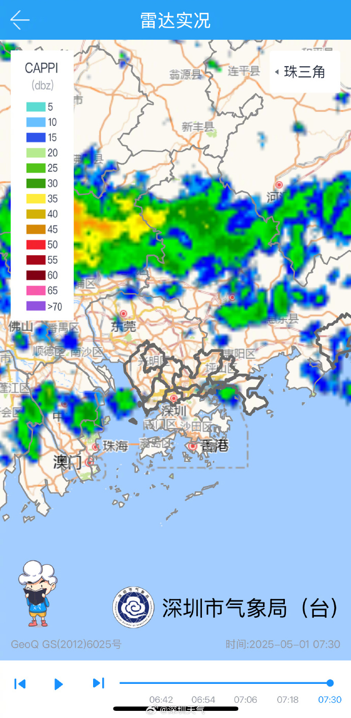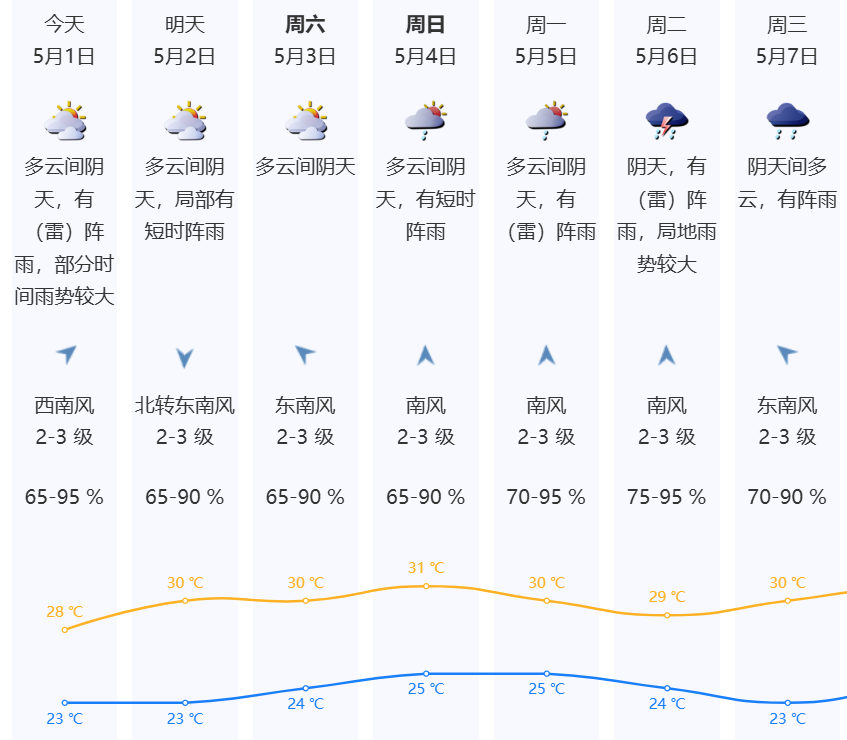 五一假期首日(1日),深圳多云转(雷)阵雨,局地雨势较大;