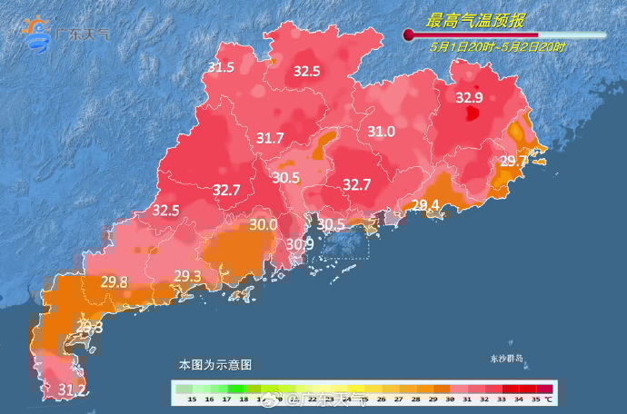5月1日,粤北和珠江三角洲北部市县阴天有中到大雨局部暴雨,其余市县多云转(雷)阵雨局部大雨,雨时中北部市县能见度偏低。最高气温:西部市县28-30℃,其余市县26-28℃。