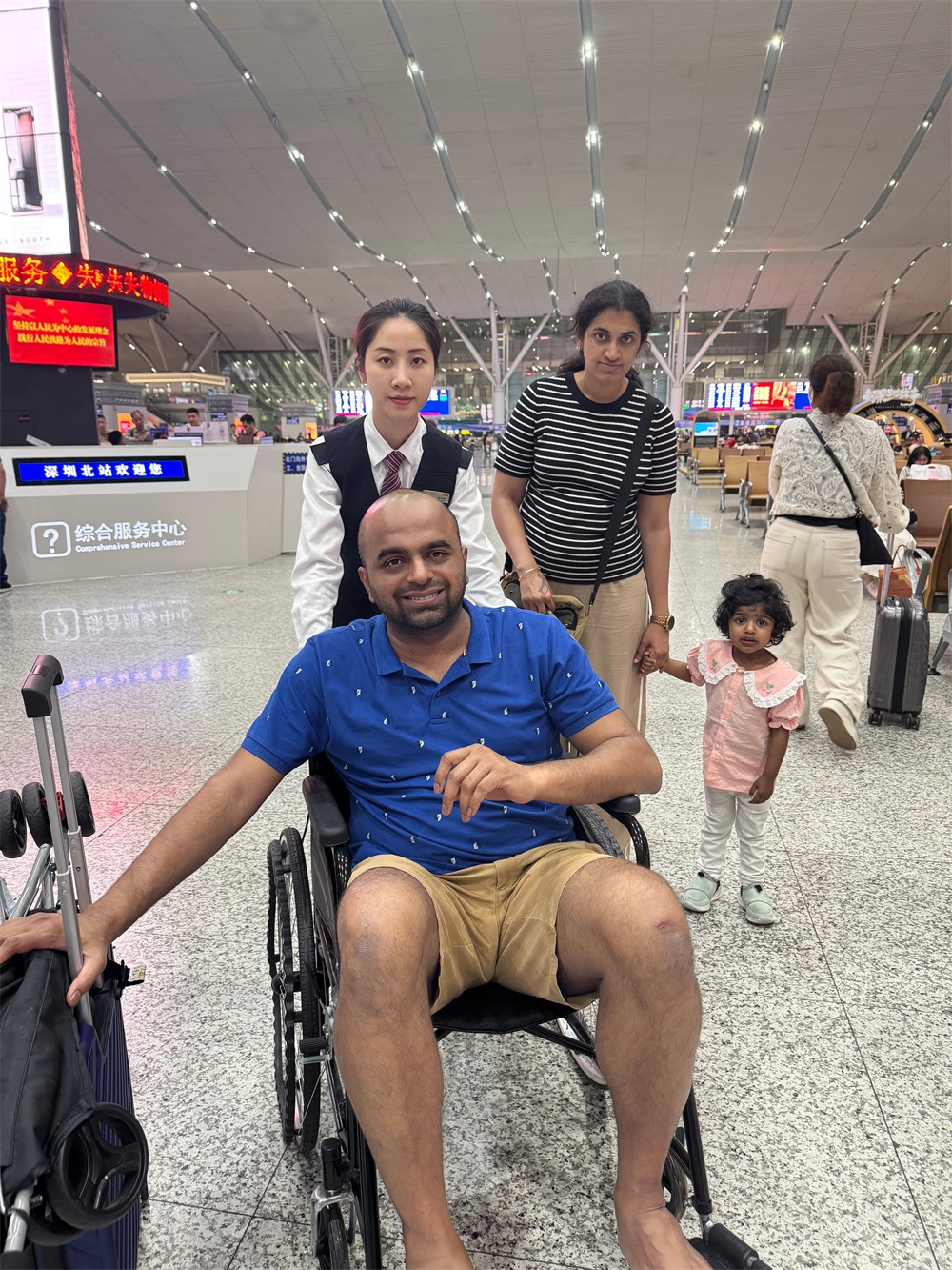 4月27日下午15点30分,服务台附近突然传来一阵急切的呼喊:“Help! ” 循声望去,原来是印度旅客艾玛焦急地求助。她的丈夫因腿部受伤无法行走,孩子和丈夫还在站台上,急需轮椅。由于艾玛过度焦急,没有带上手机和护照,也忘记了车次和站台信息,只记得列车是从香港出发的。情况紧急,队员胡冬红迅速与现场各岗位进行联控,通过多方询问得知站台客运员已经在受伤旅客身边进行看护。胡冬红立即推来轮椅,带着艾玛朝着站台方向一路小跑。到达现场后,胡冬红又协调开辟绿色通道,小心翼翼地将伤者抬上轮椅,送往出租车,并详细地与出租车司机沟通,反复叮嘱其协助将伤者送往医院就医。