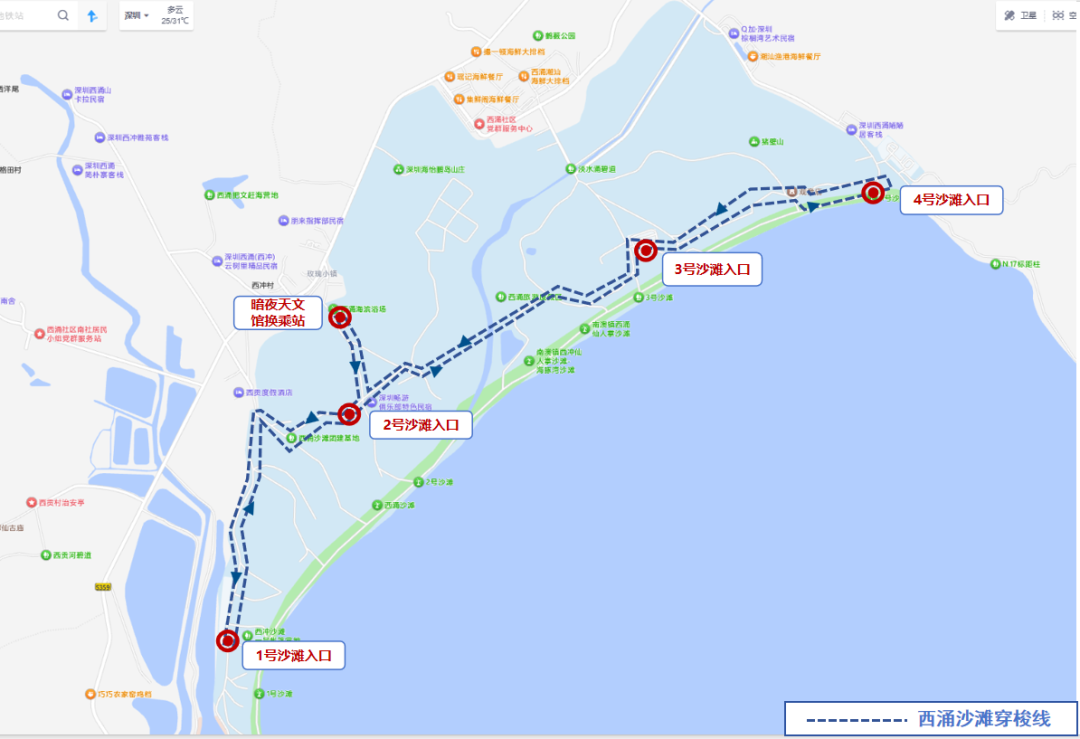 途经1号沙滩入口、2号沙滩入口、3号沙滩入口、4号沙滩入口等站点,串联西涌景区的4个海滩