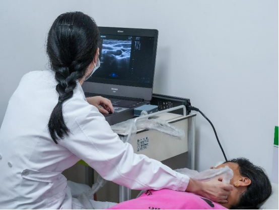 此次义诊活动开展乳腺、甲状腺及子宫附件的专项筛查,为200余名基层女性提供了精准的诊断服务。在甲状腺检查方面,依据TI-RADS分级,对甲状腺结节的性质、回声、形态、边界、钙化及血流等特征进行细致评估,精准捕捉每一个细微的异常。对于乳腺疾病,依据BI-RADS分类,从肿块大小、形态、钙化特征到血流信号进行多维度分析,为受检者提供合适的诊疗建议。特别纳入的子宫附件超声检查,针对基层高发的子宫肌瘤、卵巢囊肿等病变,通过经腹与经阴道超声结合的方式进行了全面筛查与评估,尽力检出潜在的健康隐患。