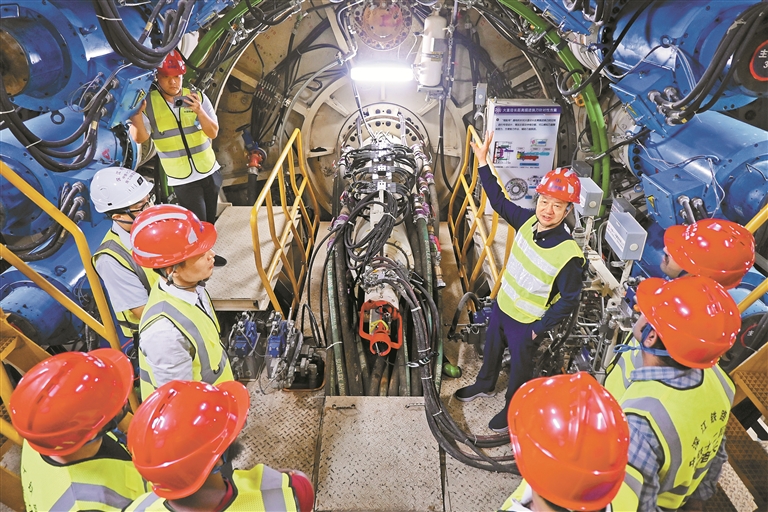 让知识融入实践,深圳大学的工程教育贴近建设一线。5月11日,一场别开生面的“国家重大工程第一课”,在建设一线开讲。深圳大学土木与交通工程学院“国际工程创新班”的30名本科生,在中国工程院院士陈湘生的带领下,深入深江铁路工程、岗厦北地下枢纽等施工现场,开展“因人施教、按需施教、应时施教”的情景(数智化)教学实践。图为师生在深江铁路项目部“领航号”盾构机旁开展现场教学。