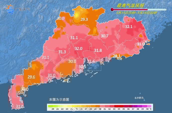 15日,韶关、清远、粤西和珠江三角洲市县多云间阴天,有(雷)阵雨,局部暴雨,其余市县多云,局部有(雷)阵雨。最高气温:东部市县31-33℃,其余市县29-31℃;