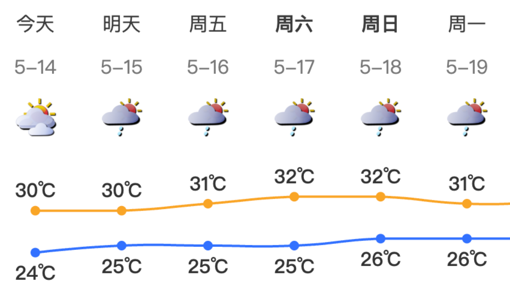 预计14日深圳多云,局地有短时阵雨,气温24-30℃,东风3级,相对湿度65%-90%;