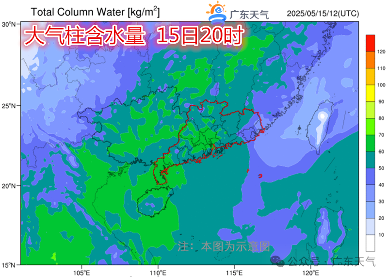 低层850hPa切变主场虽然在广东以北,但随其东移,广东的偏南风渐成气候,大气含水量逐渐增加。