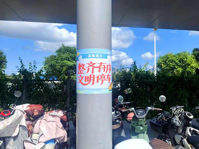 增强“温度”:宣传引导提质增效,温情服务促进共治。为引导群众养成规范停车习惯,在地铁站出入口立柱、护栏等醒目位置,精心设计并张贴“整齐有序,文明停车”温馨提示标语,增强居民规范停车意识,营造共建共治共享的良好氛围。
