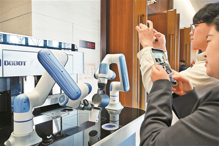深圳企业生产的双臂拉花咖啡机器人,在广东省高质量发展大会期间为参观者制作咖啡。(本报资料图片)