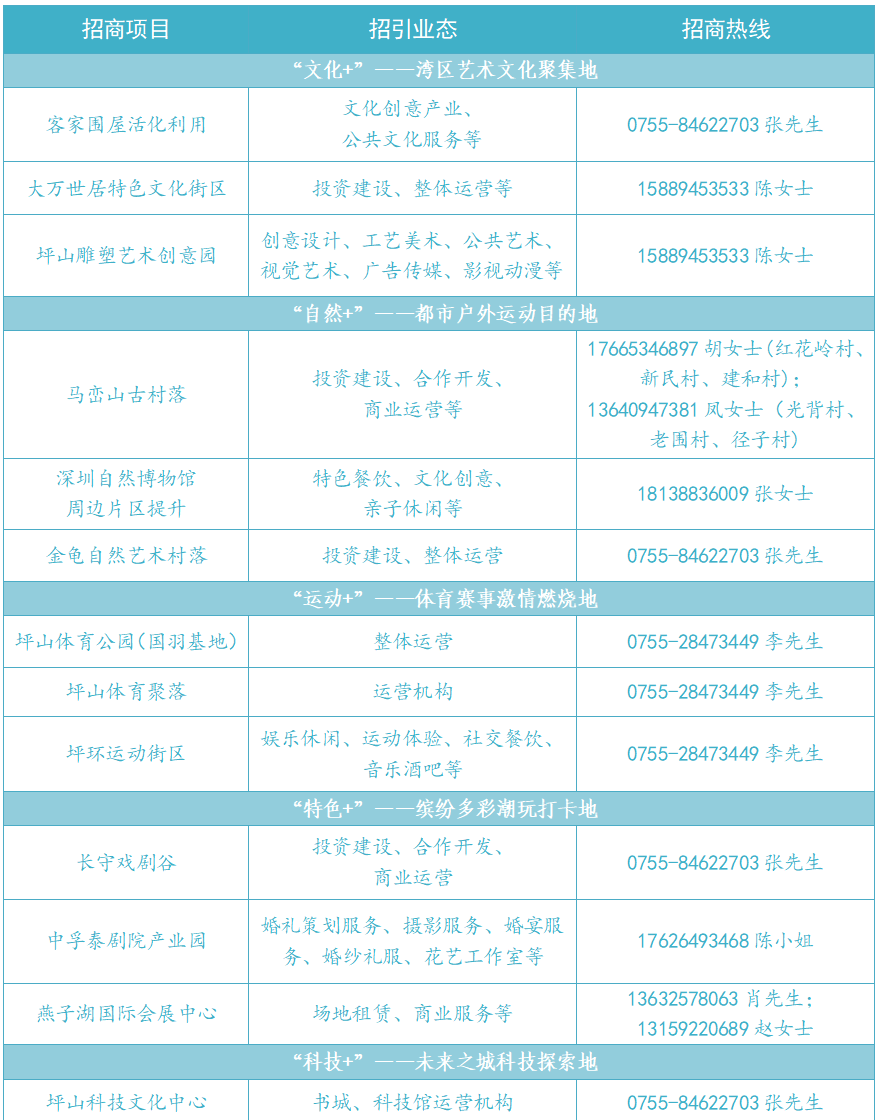 本次招商项目从文化、体育、旅游三大行业出发,打造“文旅+百业”“百业+文旅”的融合发展新生态,重点推出“文化+湾区艺术文化聚集地”“自然+都市户外运动目的地”“运动+体育赛事激情燃烧地”“特色+缤纷多彩潮玩打卡地”“科技+未来之城科技探索地”五大文旅消费场景,15项文体旅招商项目,不断丰富拓展文旅业态和消费场景,持续推动文化体育旅游产业集群高质量发展。