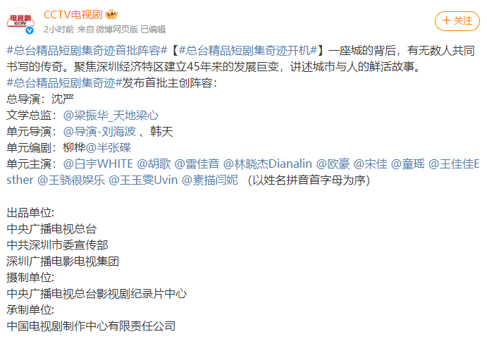 据CCTV电视剧官方微博消息,总台携手深圳市委宣传部、深圳广电联合出品的精品短剧集《奇迹》首批主创阵容正式公布。