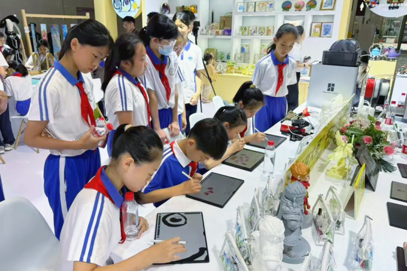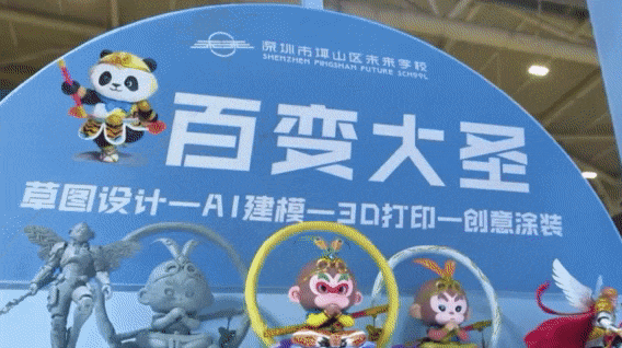 在深圳市中小学生艺术实践工作坊展区,坪山区未来学校的展位前人潮涌动、热闹非凡。一个个造型独特、充满创意的“百变大圣”模型陈列其中,从草图设计到AI建模,从3D打印到创意涂装,完整的可视化创作流程展现在观众面前。
