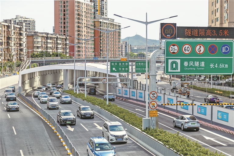 昨日12时,市民期盼已久的深圳春风隧道主线正式通车。通车后,形成“春风高架+春风隧道”立体交通走廊,将有效改善多年来滨河大道沿线春风高架段的交通瓶颈,今后经滨河大道往来罗湖、盐田等深圳东部地区将更为通畅。