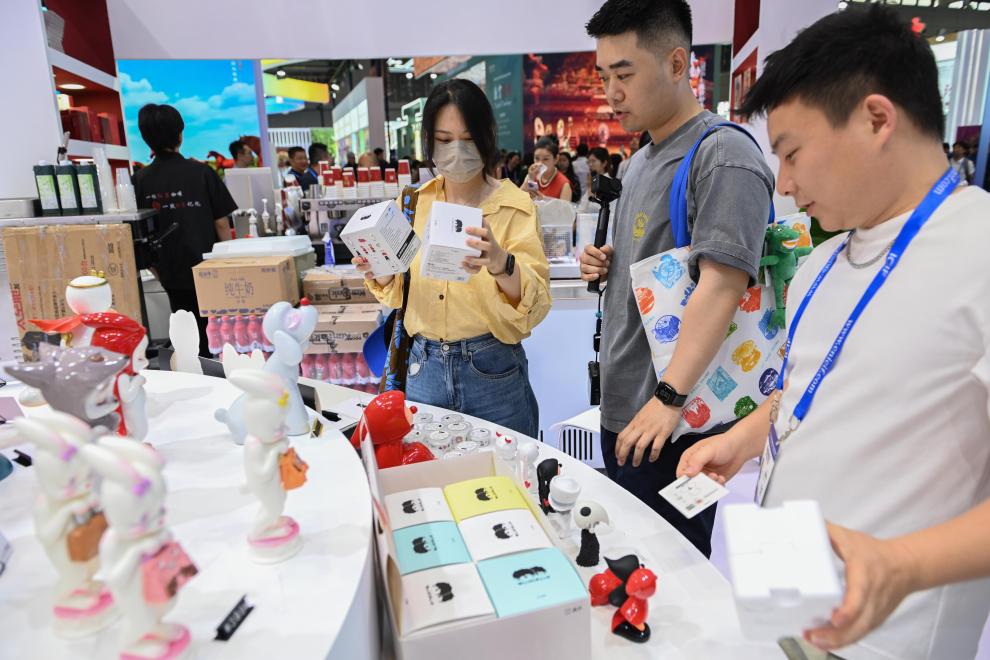5月22日,观众在文博会重庆展区挑选盲盒产品。 新华社记者 肖恩楠 摄