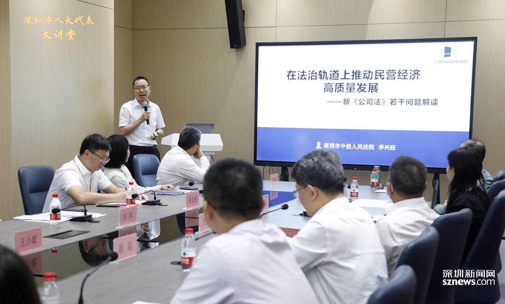 作为商事主体密度全国第一,民营经济贡献了全市50%以上的GDP、70%的税收的城市,民营经济在深圳占据了重要地位,深圳也被称为“中国民营经济第一城”。为更好实施新颁行的民营经济促进法,发挥人大代表力量,助推民营经济高质量发展,本次代表大讲堂调研了宝安区法院、宝安区矛盾纠纷多元调处中心,并聚焦民营企业关心关注的热点难点问题,联合市中级人民法院开展法律宣讲,市中级人民法院商事审判庭庭长、审判委员会委员李兴旺为各级人大代表开展主题讲座。