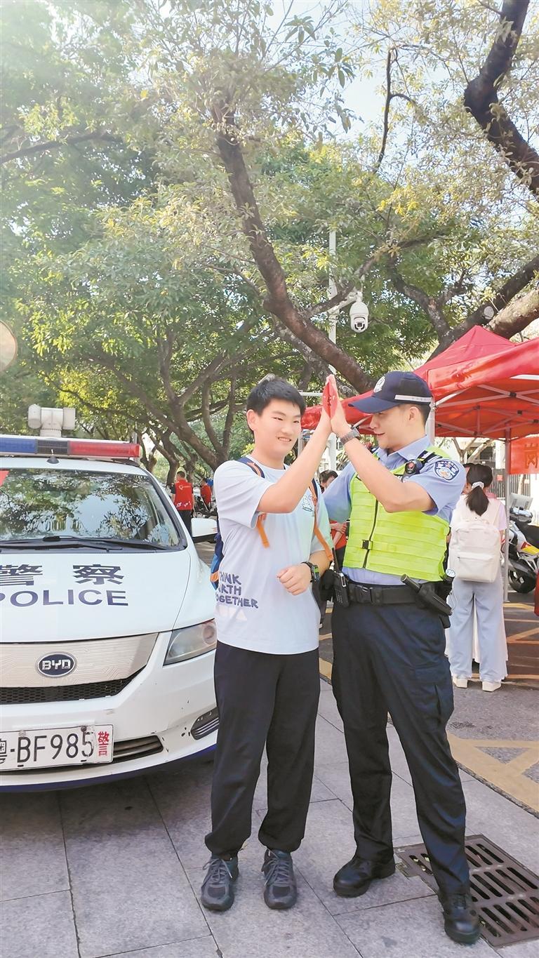 开考当天,民警唐鹏岭顶着烈日,在南头中学考点外执勤。他手上套着写有“加油”字样的贴纸,与进入考场的学子击掌,向考生传递信心,为他们鼓劲。