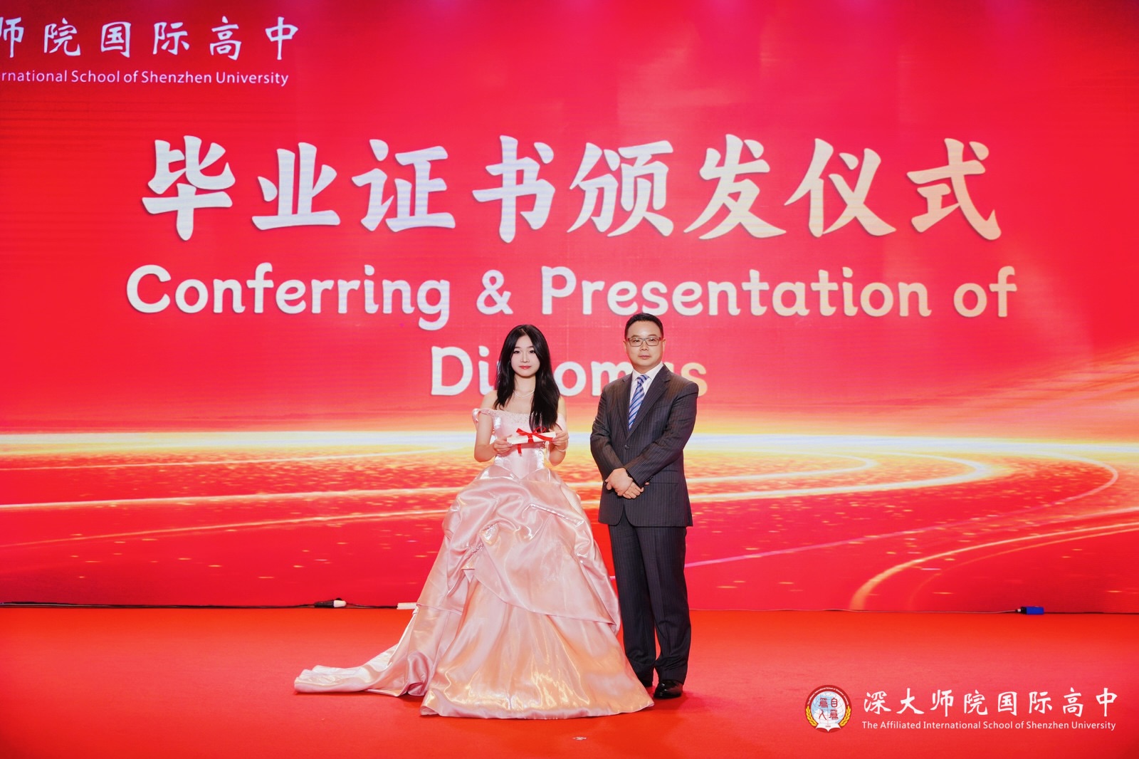 毕业证书颁发仪式上,毕业生们依次登台,从深大师院国际高中教育总监欧阳博士手中接过象征学识与成长的毕业证书,全场响起热烈的掌声,记录下属于每位毕业生的辉煌瞬间。