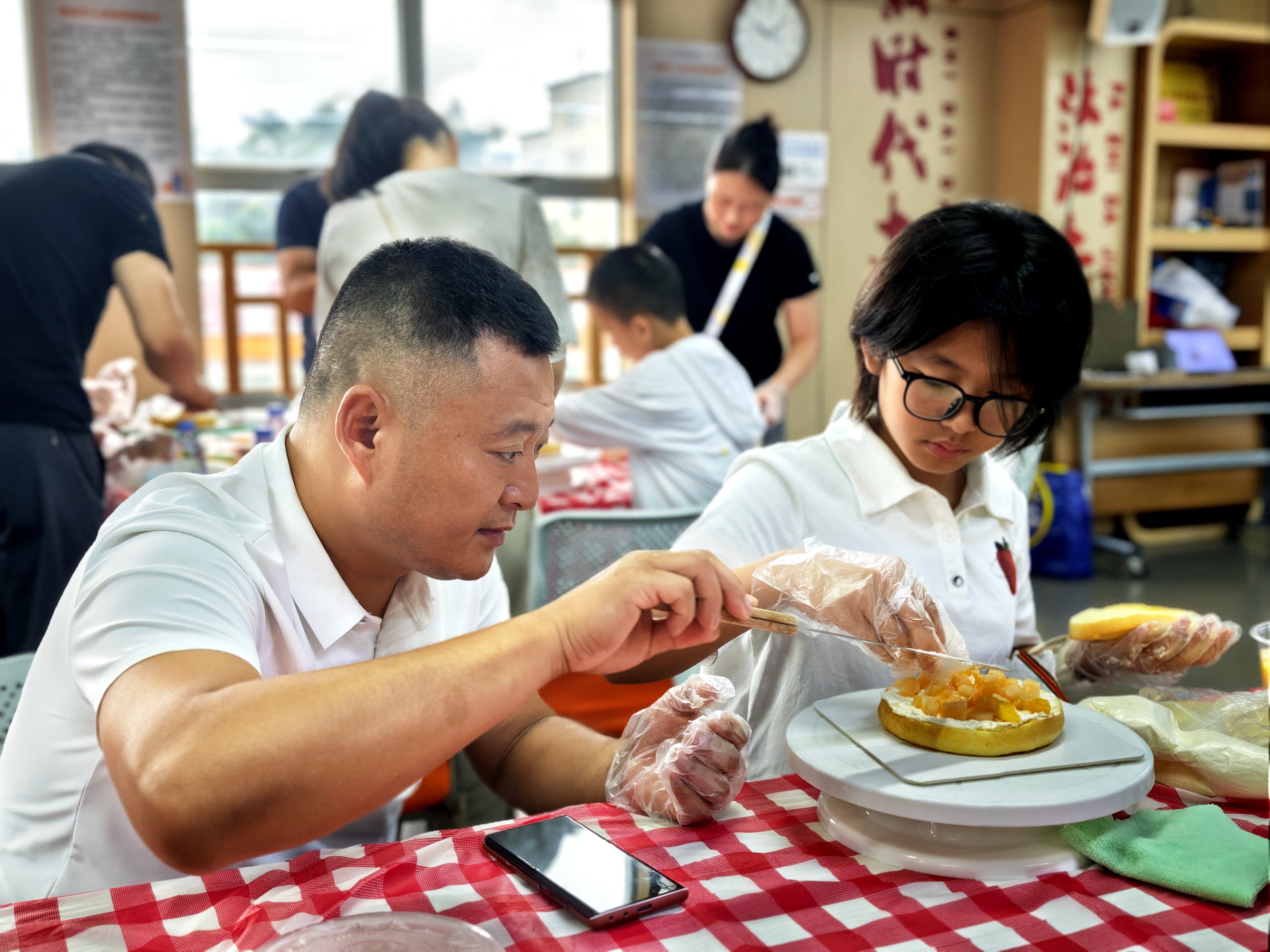 温馨的祝福卡环节,孩子们用稚嫩的笔画书写真情:“爸爸辛苦啦!”“少加班,多陪我踢球!”……质朴的告白让家长们动容。压轴的亲子DIY蛋糕制作环节中,全家协作创意满满:涂抹奶油、装点水果、精心装饰,每道工序都饱含默契与爱。