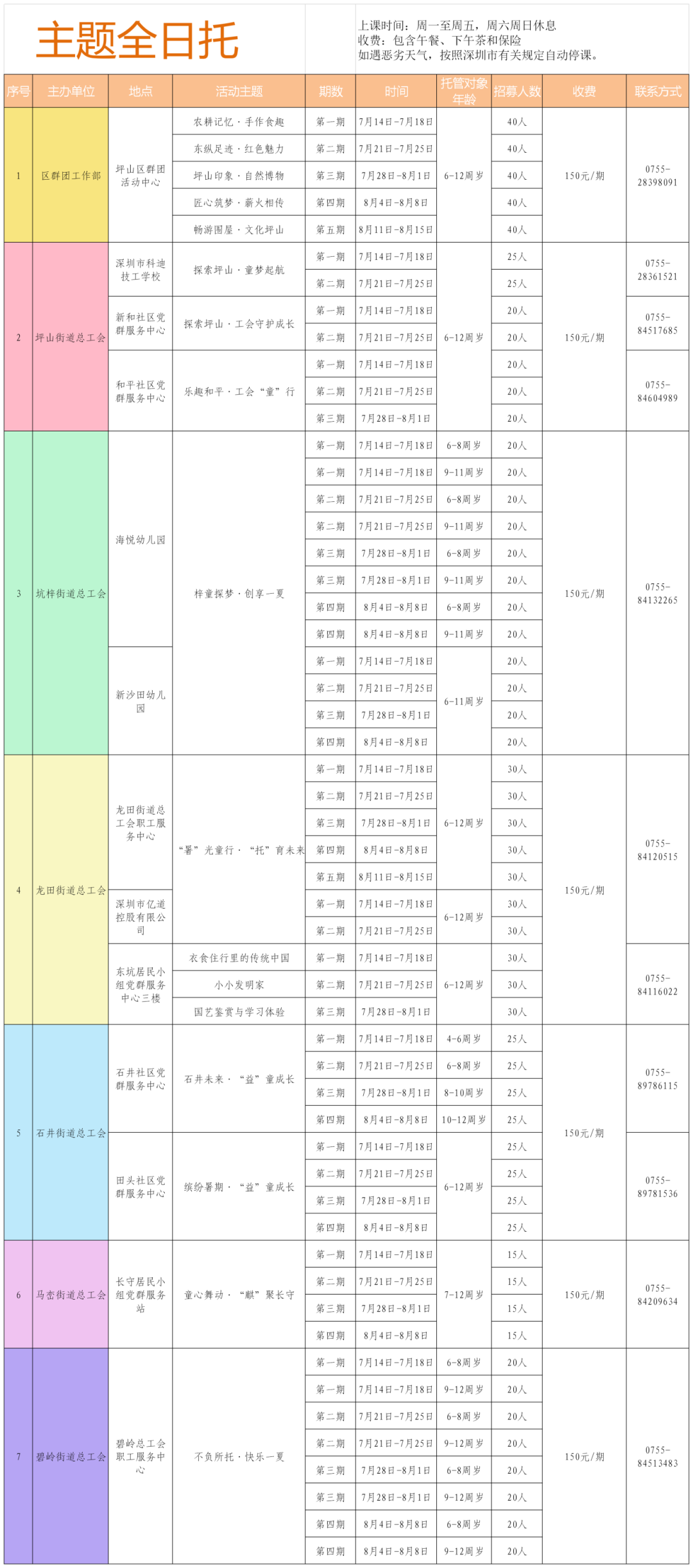 暑托班坚持“公益、自愿”原则,提供看护服务,主题全日托学生午餐(含下午茶)和保险费用150元/人/期由学生家长承担,午餐由专供校园学生餐的坪山本地餐饮企业集中统一供餐配餐,保证食品安全以及配餐的科学营养搭配。部分特色半日托按照199.5元/人/期收取材料费。