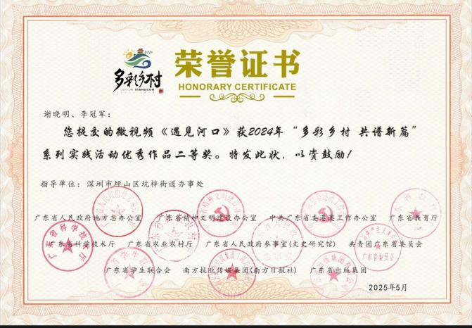 其中,在广东省公布的2024年“多彩乡村 共谱新篇”系列活动获奖名单中,坪山区报送的《在河口》《遇见河口》两个作品分别斩获歌舞创作、微视频类别二等奖,且《在河口》作品还是该类别仅有的6个二等奖作品之一。