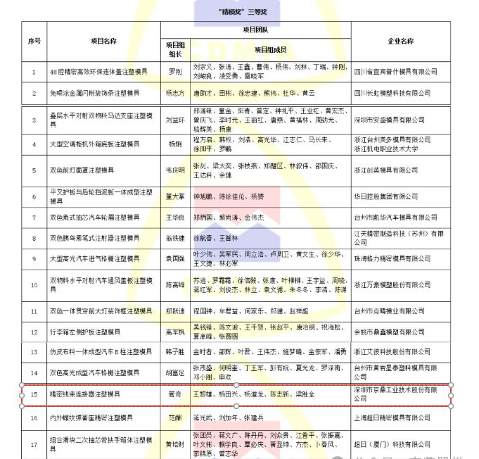 6月26日,中国模协公布了2023-2025年度中国模具工业协会“精模奖”项目科技成果评定认定结果,京鼎工业以“精密线束连接器注塑模具”项目首次参评,荣获精模奖三等奖。