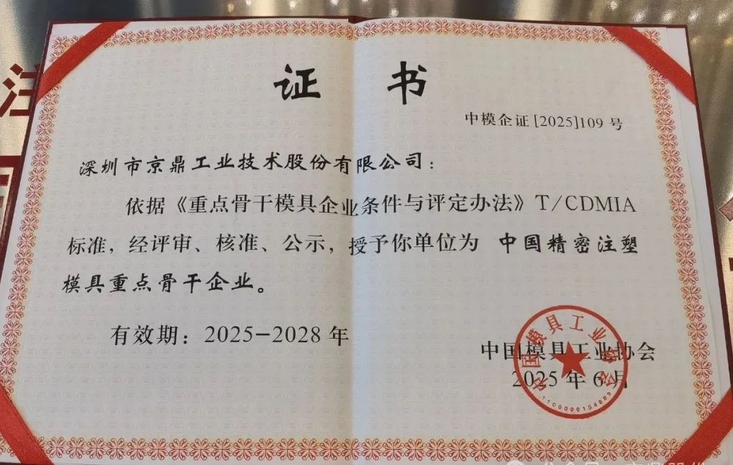 深圳新闻网2025年7月2日讯(记者 邱嘉熙)近日,坪山辖区企业深圳市京鼎工业技术股份有限公司(以下简称“京鼎工业”)获评“中国精密注塑模具重点骨干企业”称号、中国模协“精模奖”三等奖。两大奖项是对该企业在精密注塑模具领域专注发展二十余年的肯定与激励。