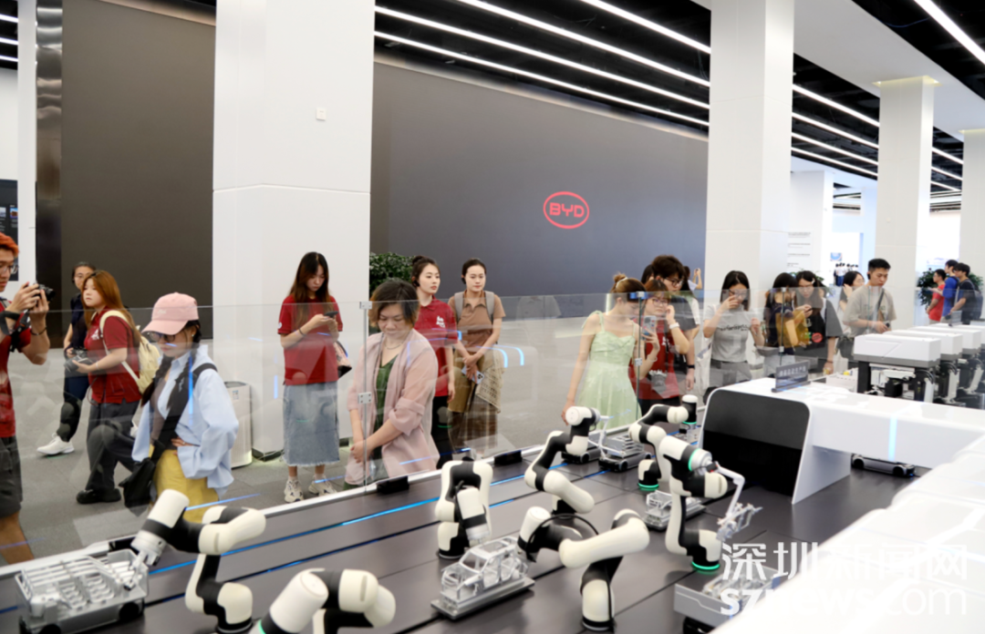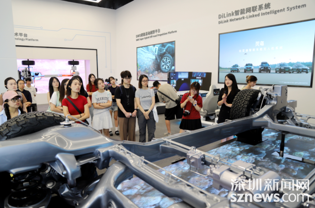 来到坪山的首站,师生们踏入比亚迪总部。在礼宾楼展厅里,炫酷的车型展示、巨大的“专利墙”,轮番吸引着大家的注意力。师生们从这些展示中,不仅能领略到比亚迪作为新能源汽车行业领军者的创新气质,也感受到坪山涌动的科技创新力量。