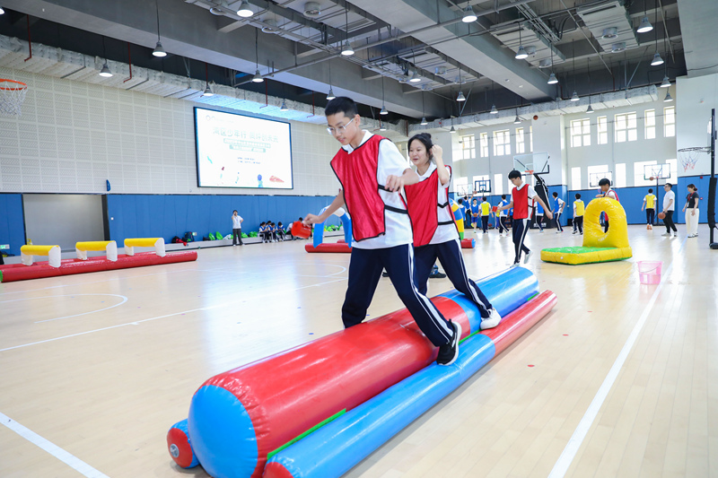 肩并肩、腿绑腿,步伐一致地向前冲!“三人四足”投篮游戏中,深港少年们绑带刚系好就迫不及待往前蹦,跌跌撞撞冲向篮筐,在终点时,下蹲蓄力、奋力将篮球抛向天空——篮球“哐当”一声入网,阵阵掌声顿时响起。