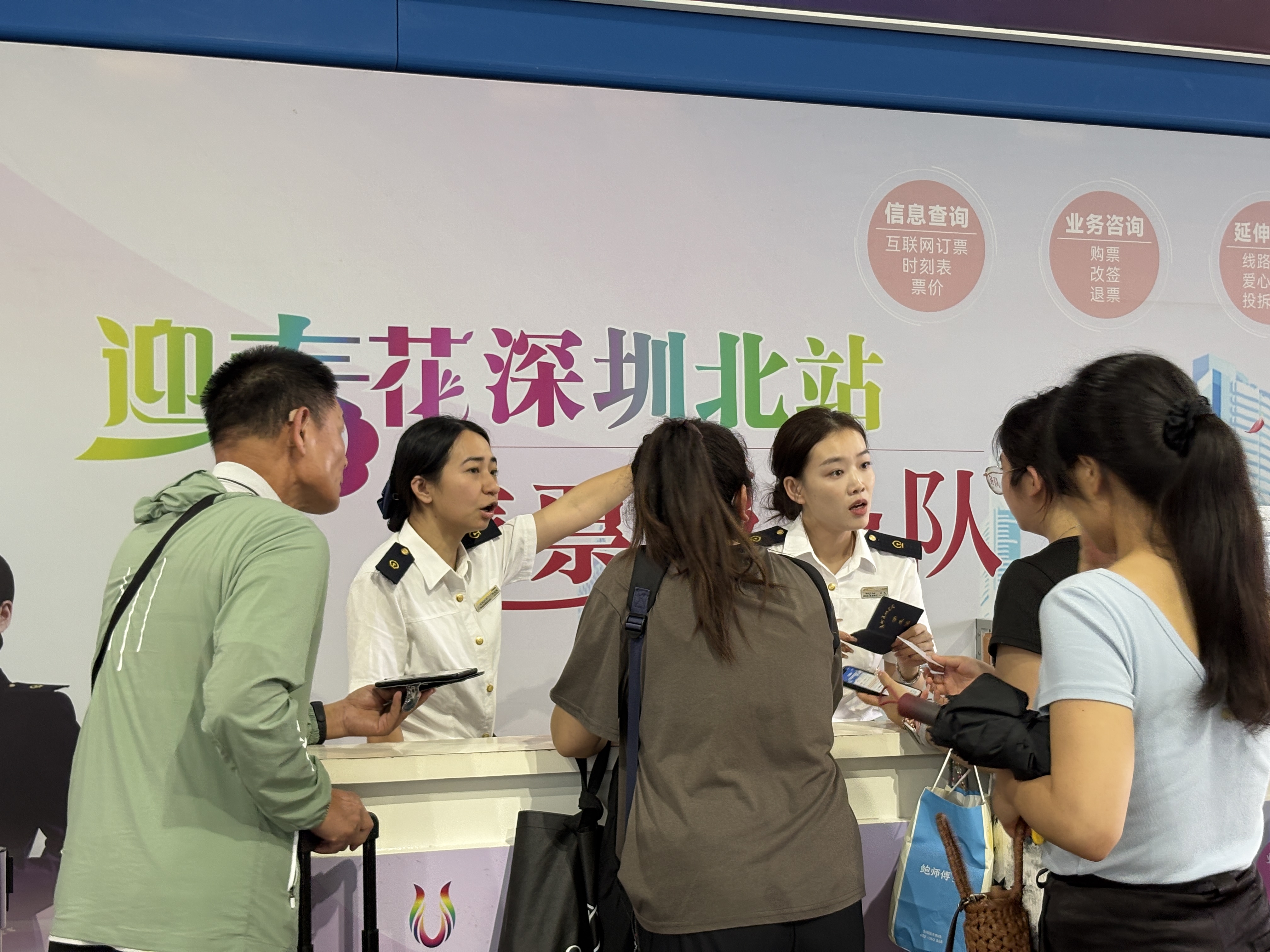 面对大客流与极端天气的双重挑战,深圳铁路各大火车站努力为旅客营造“安全、便捷、温馨”的出行环境。深圳北站在台风期间设立应急服务台,为滞留旅客提供改签、退票指引,累计服务受影响旅客超1500人次。同时,通过售票厅电子屏实时播放出行指南,引导旅客快速分流;针对老年、儿童等特殊旅客群体,开通“绿色通道”并提供一对一帮扶,暑运以来已协助1700余名重点旅客顺利出行;为方便旅客快速换乘,自7月19日起,深圳北站每周末14:00起开启高铁接驳地铁的免安检通道(高铁站A2出口接驳地铁4号线D出口),高铁抵深旅客可快速换乘地铁,提升通行效率。福田站围绕“三语四通”服务岗为外籍旅客、港澳同胞提供多语种咨询,并联合地铁、公交部门推出“无缝接驳”服务。