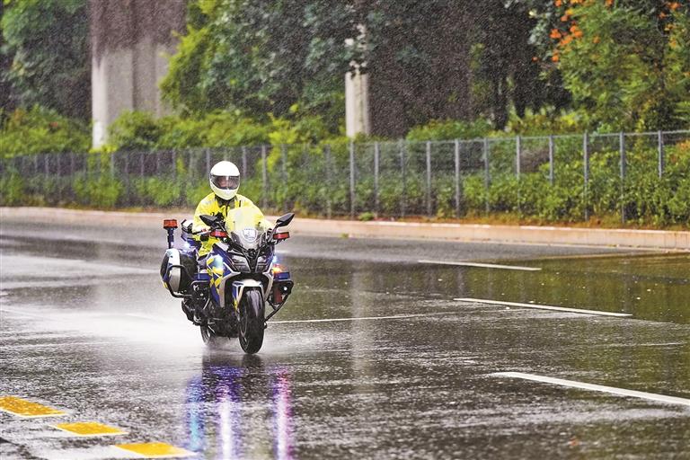 交警铁骑冒着暴雨出勤。 深圳晚报记者 陆颖 摄