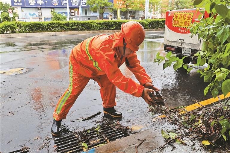 环卫工人冒雨在后海大道清理雨水篦子。深圳晚报记者 陈玉 摄