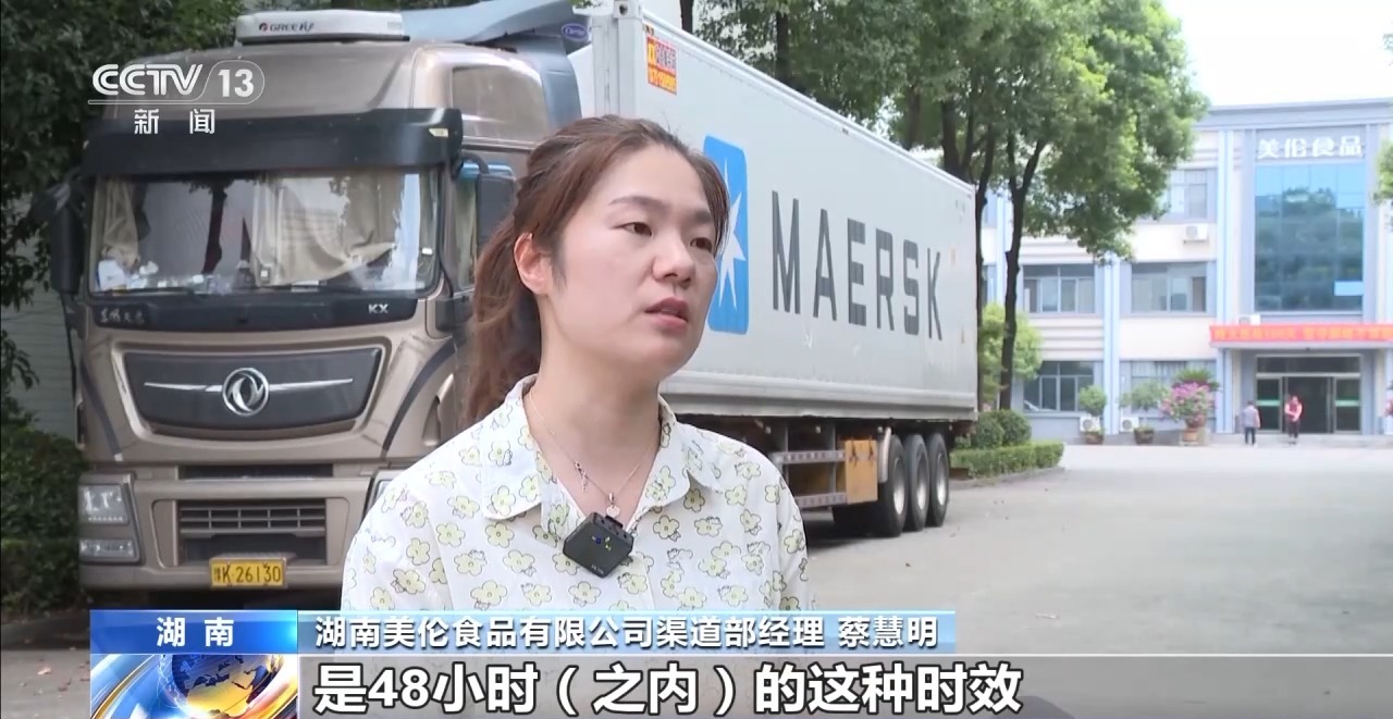 湖南美伦食品有限公司渠道部经理 蔡慧明:基本上是24小时之内,车辆到我们的工厂,然后从工厂达到港口是48小时(之内)的这种时效。全程冷链才能保证我们的产品形状的完整。