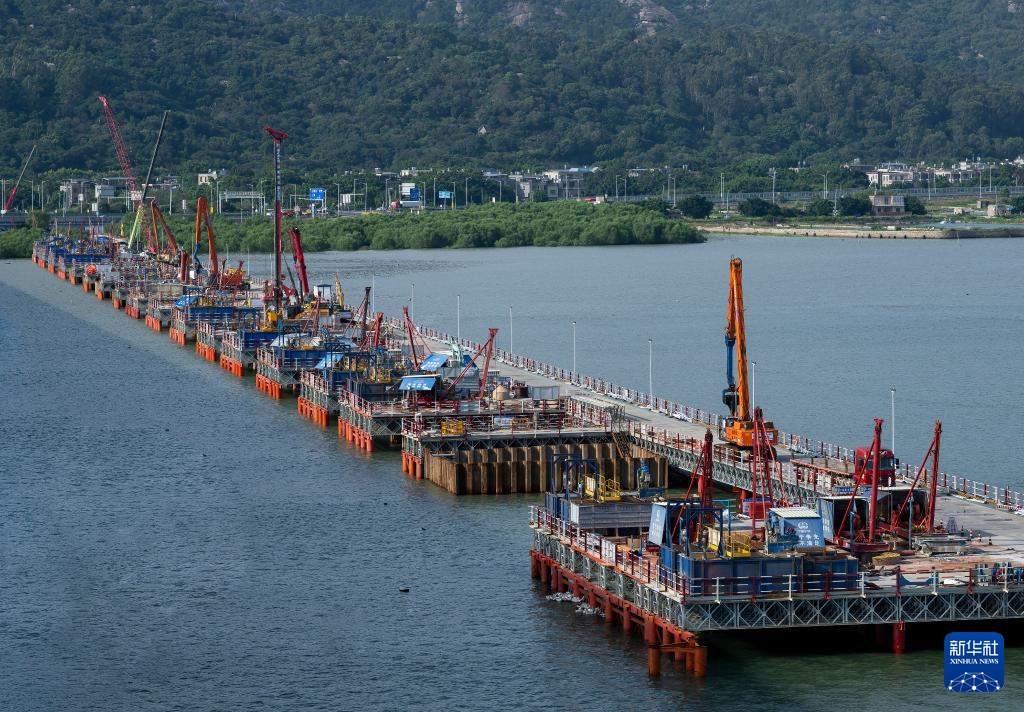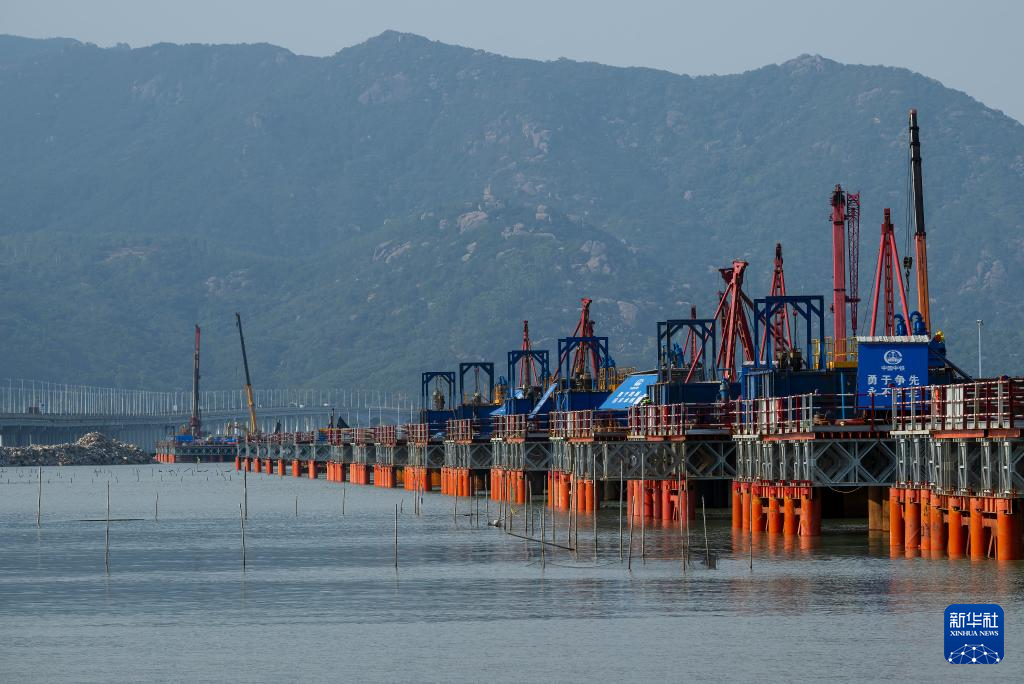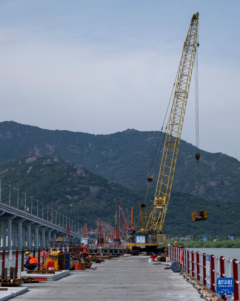 这是漳江湾跨海特大桥主栈桥桩基施工现场(7月16日摄)。