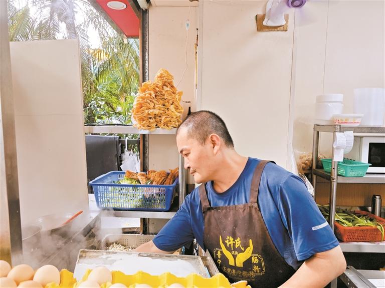 “老板,早啊!”到了早餐时间,几位顾客快步走进小店,跟老许挥手打声招呼就找位置坐下。老许起身微笑回应,“来啦,稍坐一会马上好。”他系上带有米浆斑点的围裙,开始打鸡蛋、倒米浆、搅肉末、放青菜,动作行云流水,不一会儿,冒着热气和香气的肠粉就摆在顾客面前,最低10元可品尝一份肠粉。